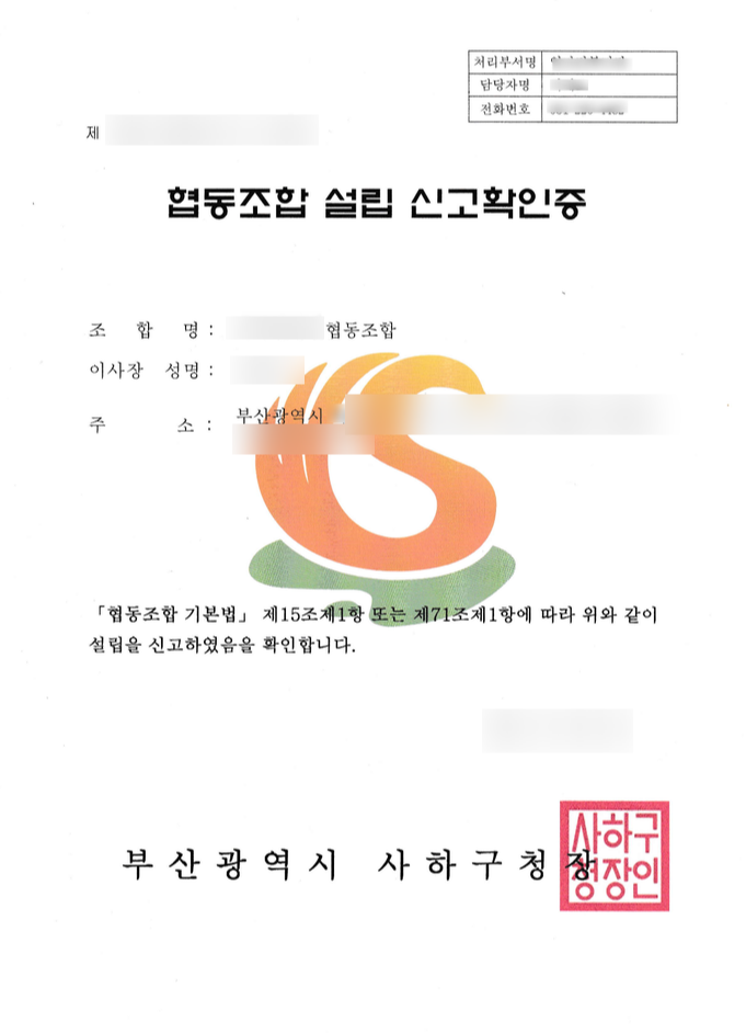 협동조합 설립 신고를 마치면 위와 같은 설립신고증이 나옵니다.