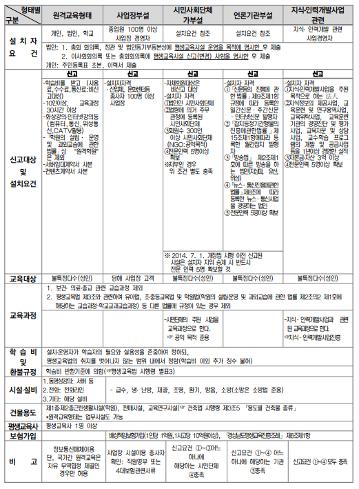 내용을 간단히 설명하자면 법인의 정관 및 회의록에 평생교육원을 설치하여 운영하겠다는 내용이 포함되어 있어야 하며, 임원들은 결격사유가 없어야 합니다(성범죄, 기타 결격사유 등). 시설은 근린생활시설 2종이어야 하며, 크기가 클 경우 연구시설이어야 합니다. 이 외에 전문인력에 대한 고용 이력서를 포함하여 제출하면 됩니다.