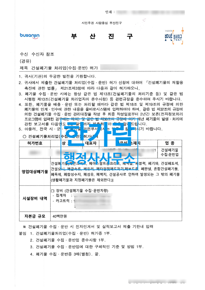 건설폐기물 수집운반 사업계획서 작성 등 대행이 필요하신 분들은 언제든 연락주시기 바랍니다.