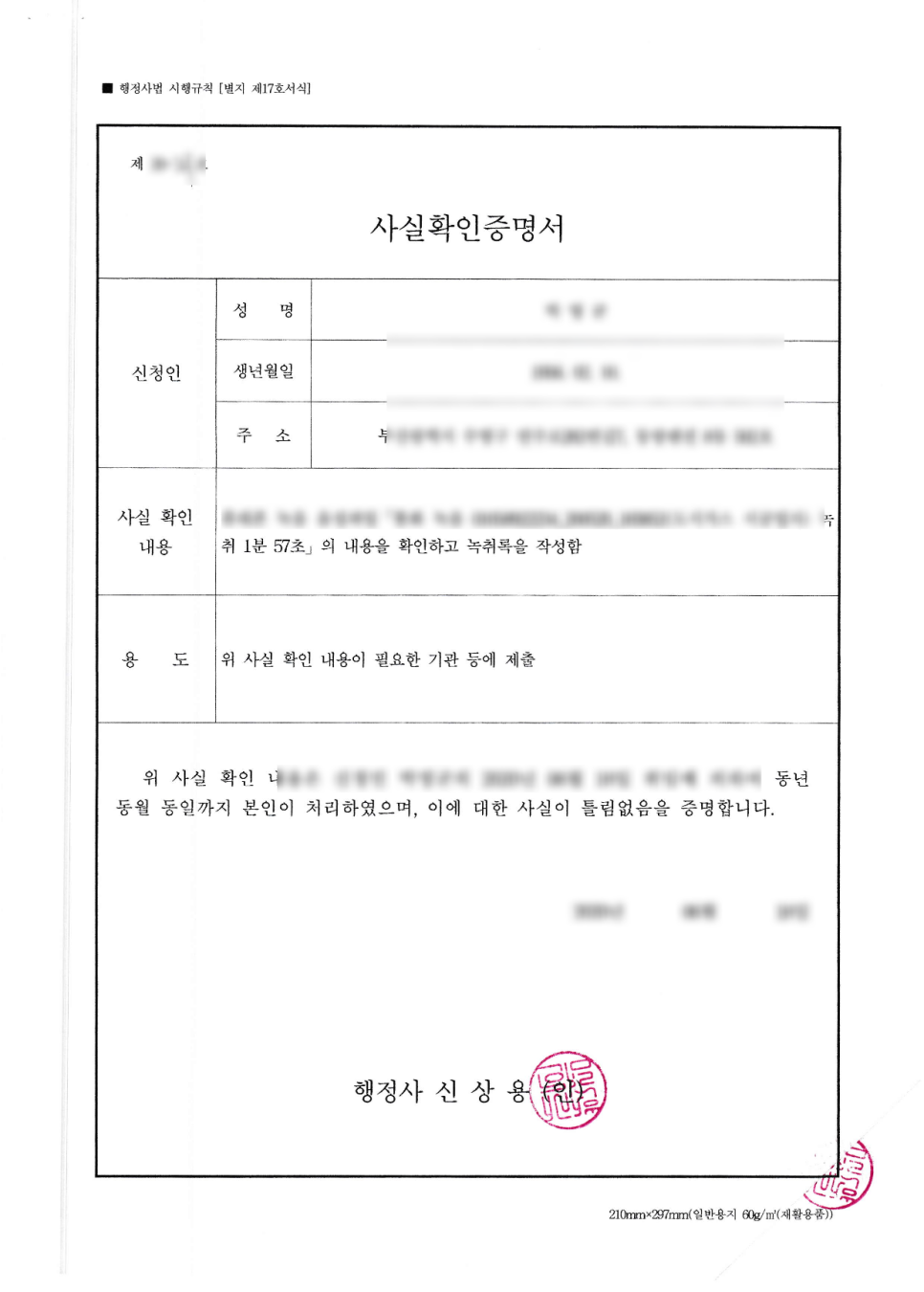 작성 방법은 파일을 카톡, 메일 등으로 전달해 주시면 초안을 작성해 보여드리고 이후 확인 절차가 끝나면 녹취록 작성 + 간인 / 날인 등을 하여서 보내드립니다. 녹취록 가격이 걱정되는 분들은 필요한 부분만 발췌하여 달라고 하시면 됩니다.