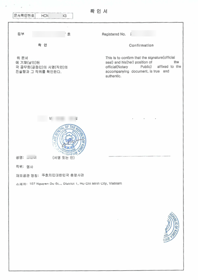 소요기간 : 근무일 기준 20일(번역공증, 외무성 공증, 대한민국 영사관 인증 모두 포함)