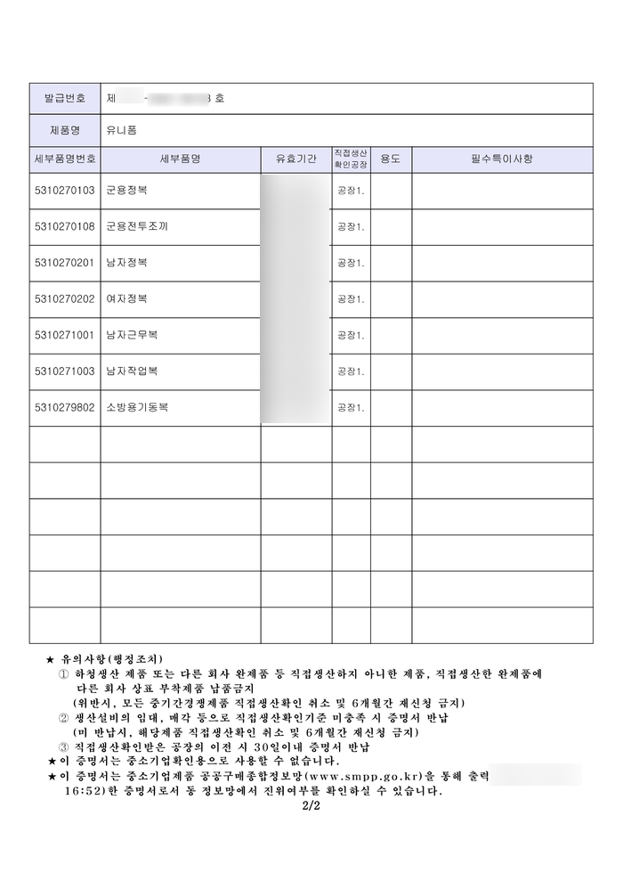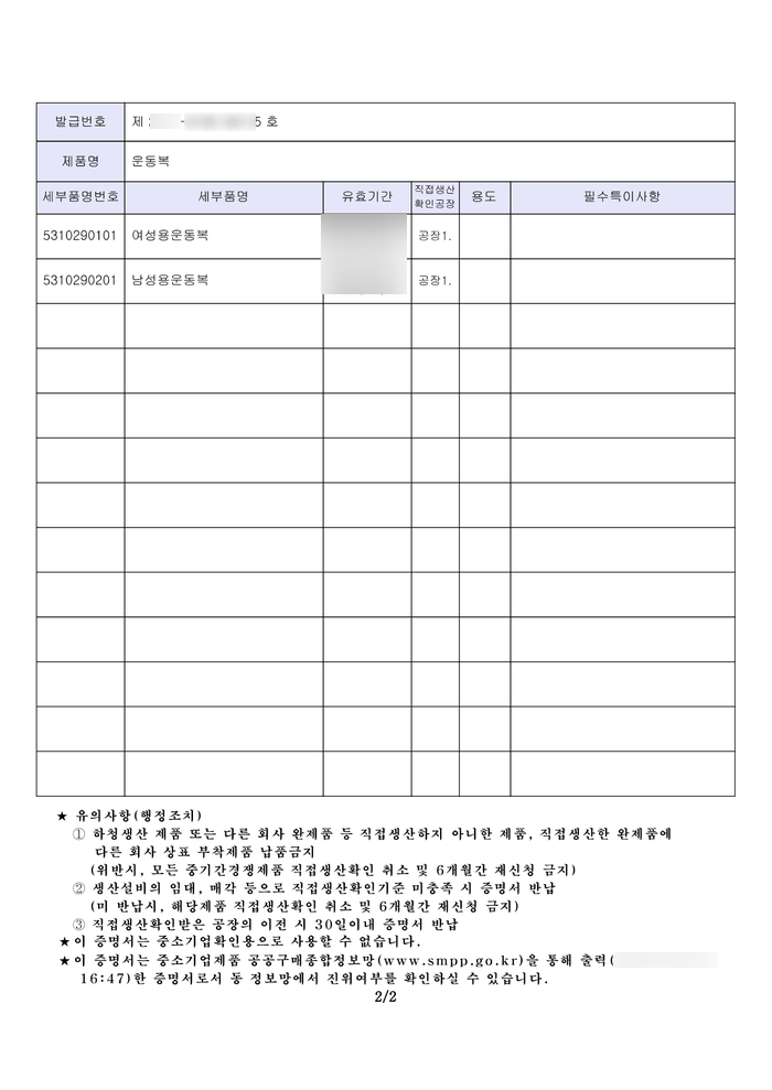 아래는 이번에 받은 속옷, 운동복, 유니폼의 직접생산확인 증명서입니다.
