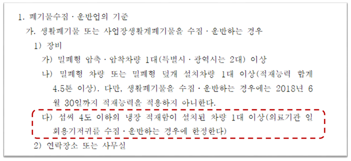 일반 사업장생활계는 서울 및 광역시는 차량 3대, 다른 지역은 2대(총 적재중량 4.5톤 1대 이상, 압축압착차량 1대 이상)가 있어야 하는데, 기저귀를 수집운반 하기 위해서는 섭씨 4도 이하의 냉동탑차 1대만 있으면 됩니다.