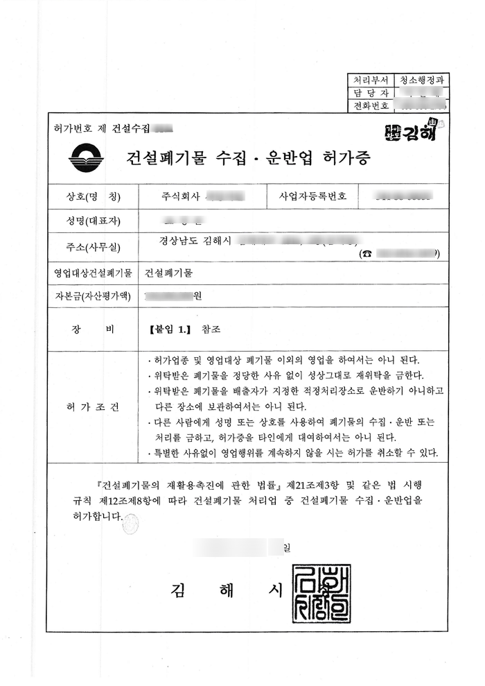 나머지 수집운반업은 자본금에 관한 사항이 필요 없지만, 건설폐기물은 법인 2천만원 이상, 개인 4천만원 이상의 자본이 있어야 합니다.