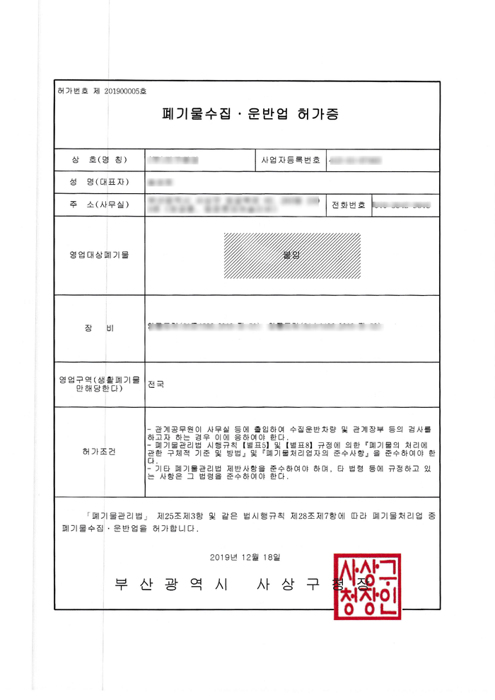 부산 사업장배출시설계 수집운반업 허가 / 허가증 수령