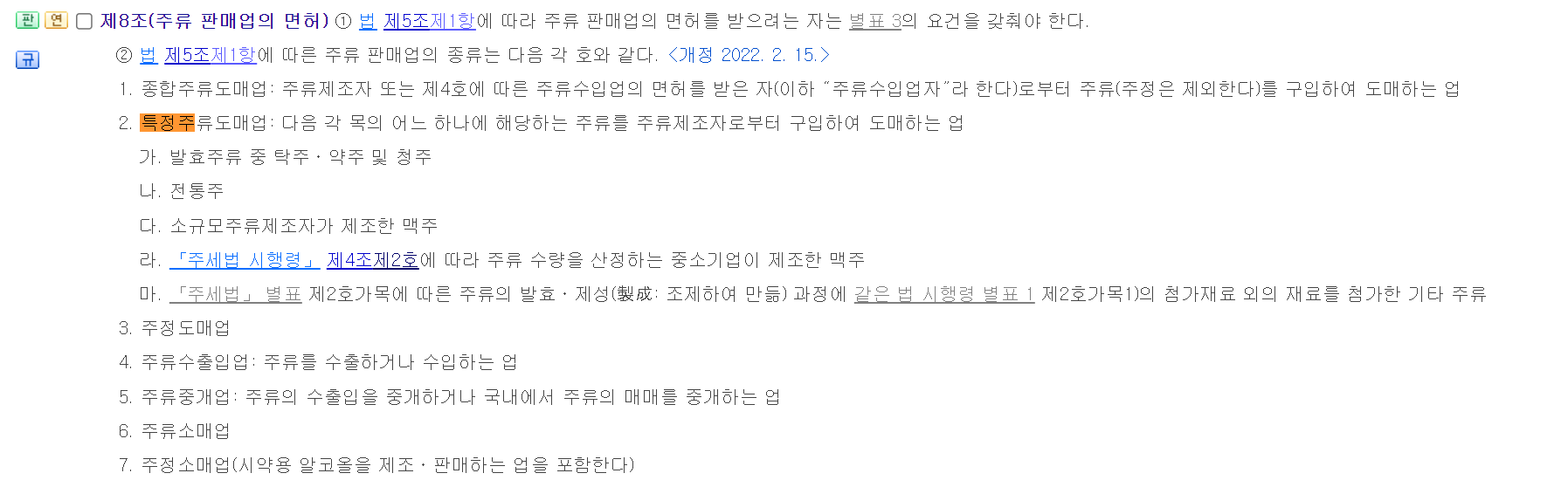 특정주류도매업은 발효주류 중 탁주ㆍ약주 및 청주, 전통주, 소규모주류 제조자가 제조한 맥주 주세 법령에 따른 주류 수량을 산정하는 중소기업이 생산한 맥주 중 하나를 구입하여 도매하는 업입니다.