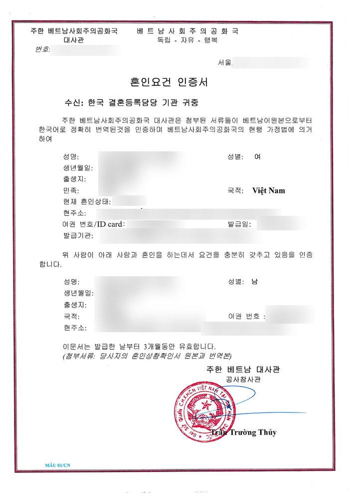 혼인요건인증서 발급을 위해서는 한국, 베트남의 서류가 모두 갖춰져야 하며, 건강진단서(에이즈, 정신질환 여부 확인), 범죄경력확인서 등이 필요합니다.