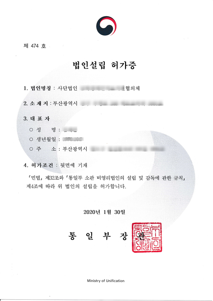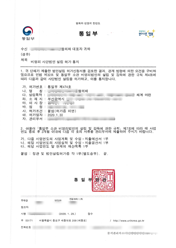 작년 말부터 진행했던 통일부 소관 사단법인 설립 허가가 나와 포스팅 합니다.