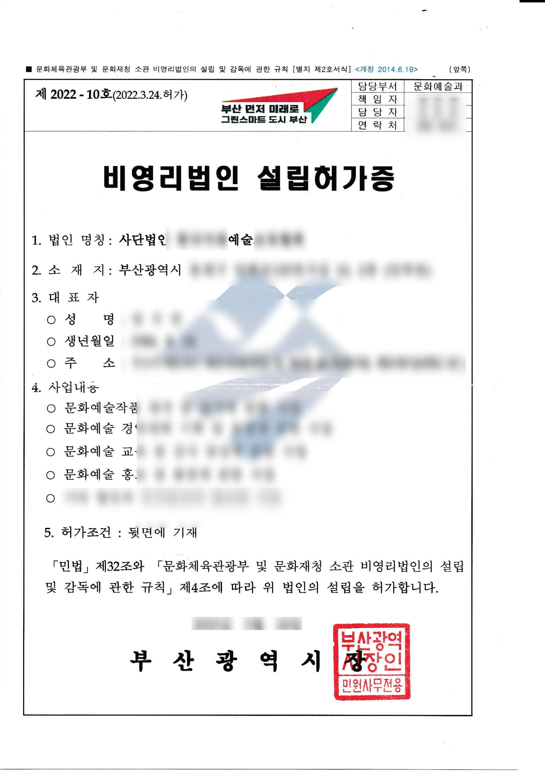 오늘은 부산광역시청으로부터 예술단체 사단법인 설립 허가를 받은 내용을 포스팅 하도록 하겠습니다.