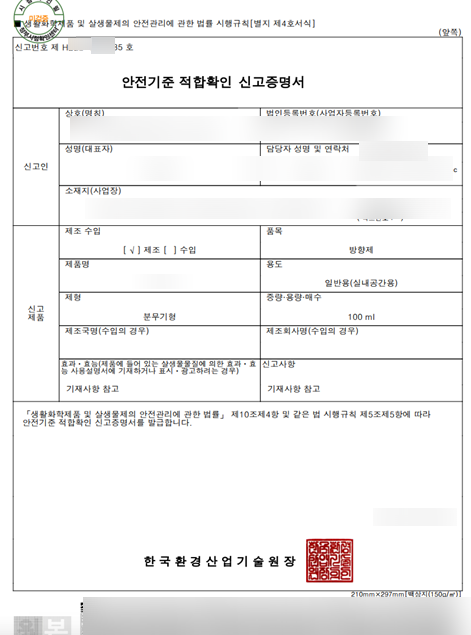 생활화학제품 신고를 위해서는 시험검사기관의 성적서를 받아, 신고서류를 작성해 올려야 합니다.