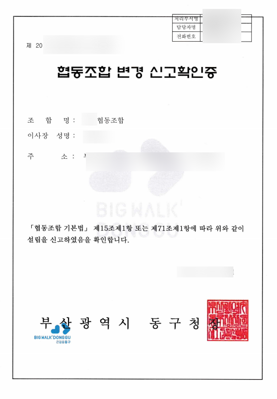 협동조합의 임원, 정관, 주소 변경 등 업무가 필요한 경우 연락주시기 바랍니다.