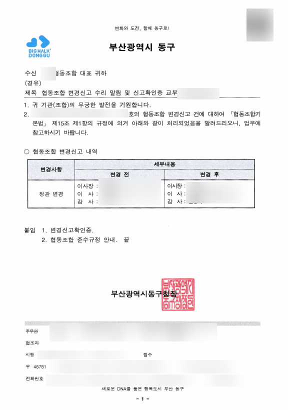 협동조합 설립 이후 임원 변경 신고, 주소 변경 신고, 정관 변경 신고 등으로 다시 업무를 맡겨주시는 경우가 자주 있습니다.