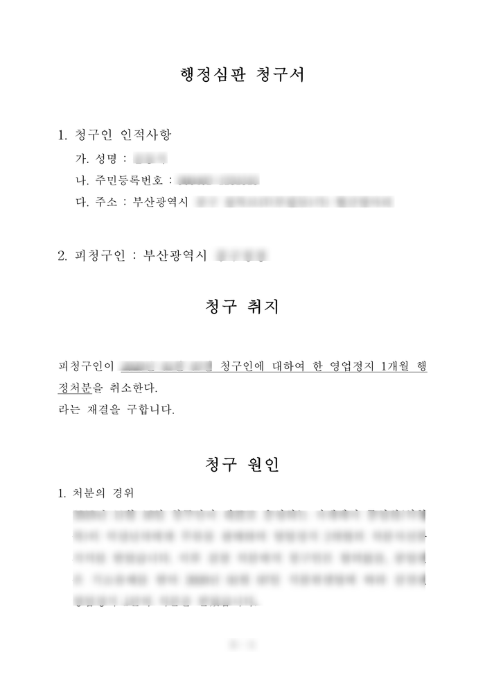 행정심판 청구서는 청구인과 피청구인의 인적사항, 청구 취지, 청구 원인 및 결론 등으로 작성을 합니다.