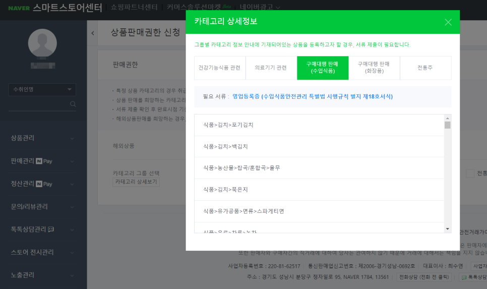 네이버 스마트스토에서 영업등록증이 없으면 구매대행판매(수입식품) 카테고리에 상품등록이 되지 않습니다.