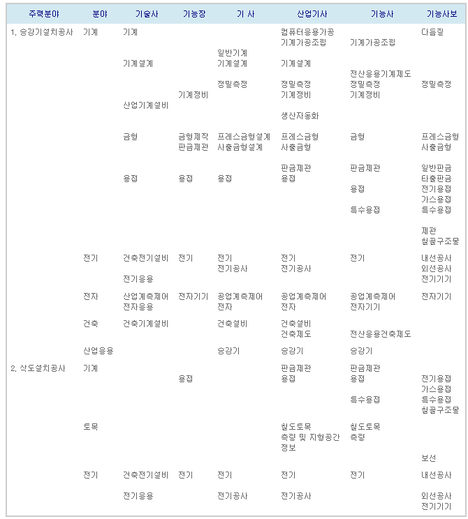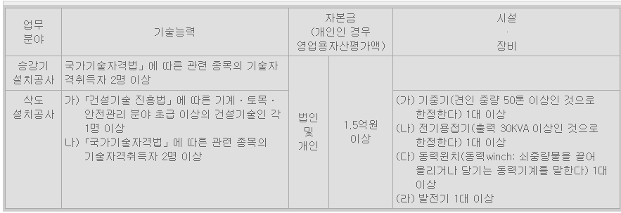 승강기설치공사와 삭도석치공사가 통합되어 있기때문에 신청시 각 업무분야 별 요건을 확인해야합니다.