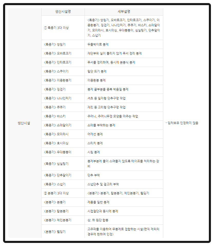 생산시설은 특종기, 본봉기가 있어야 하며, 세부 기종 등은 아래와 같습니다.