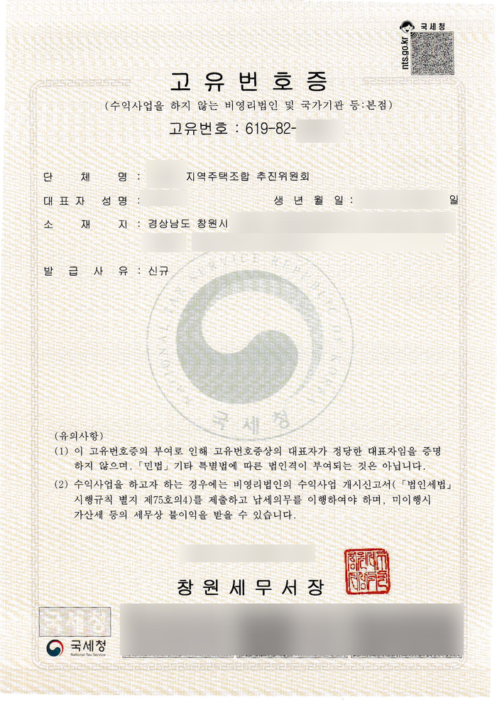 지역주택조합 추진위원회 고유번호증 발급(임의단체, 법인으로 보는 단체 설립)