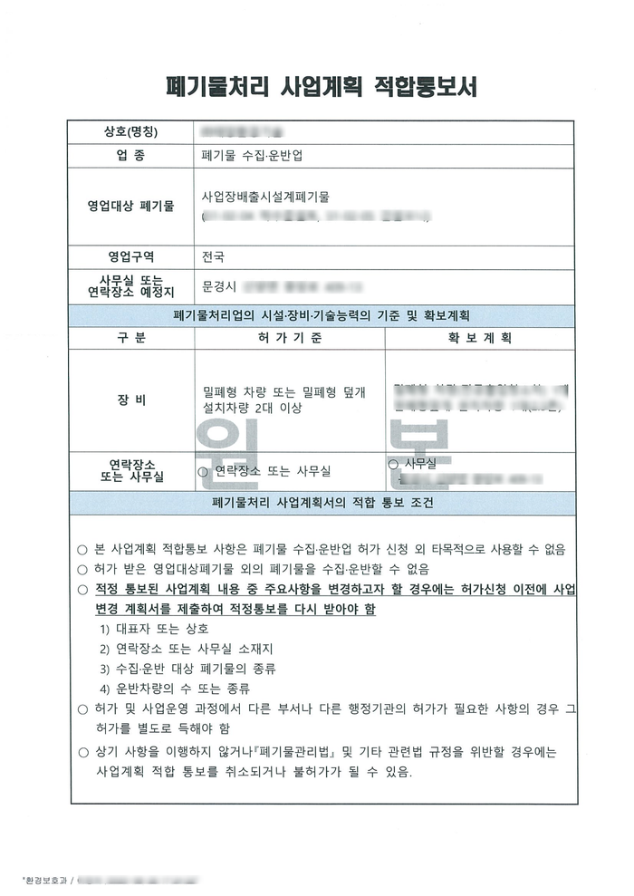 폐기물수집운반 허가 사업계획 적합통보 수령