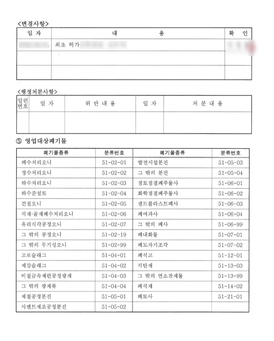이번에 허가받은 영업대상 폐기물은 다음과 같습니다.