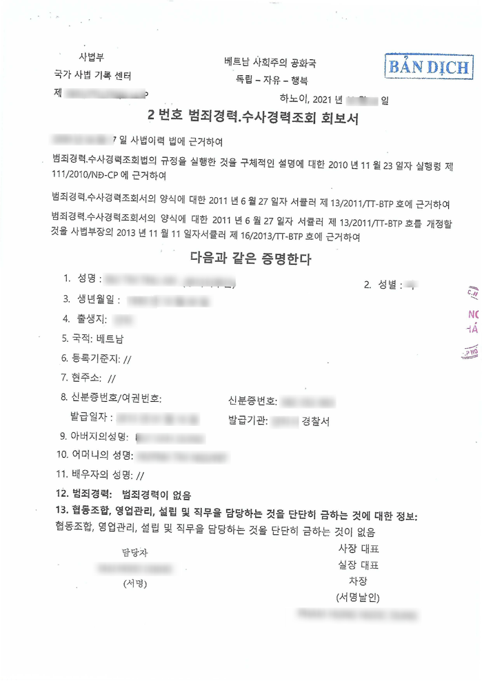 베트남 범죄경력증명서는 국제결혼, 영주권, 귀화 등 사용할 일이 많은데,
