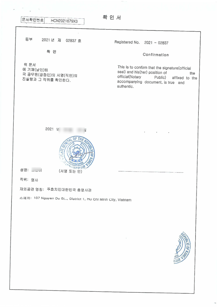 소요기간 : 근무일 기준 20일(번역공증, 외무성 공증, 대한민국 영사관 인증 모두 포함)