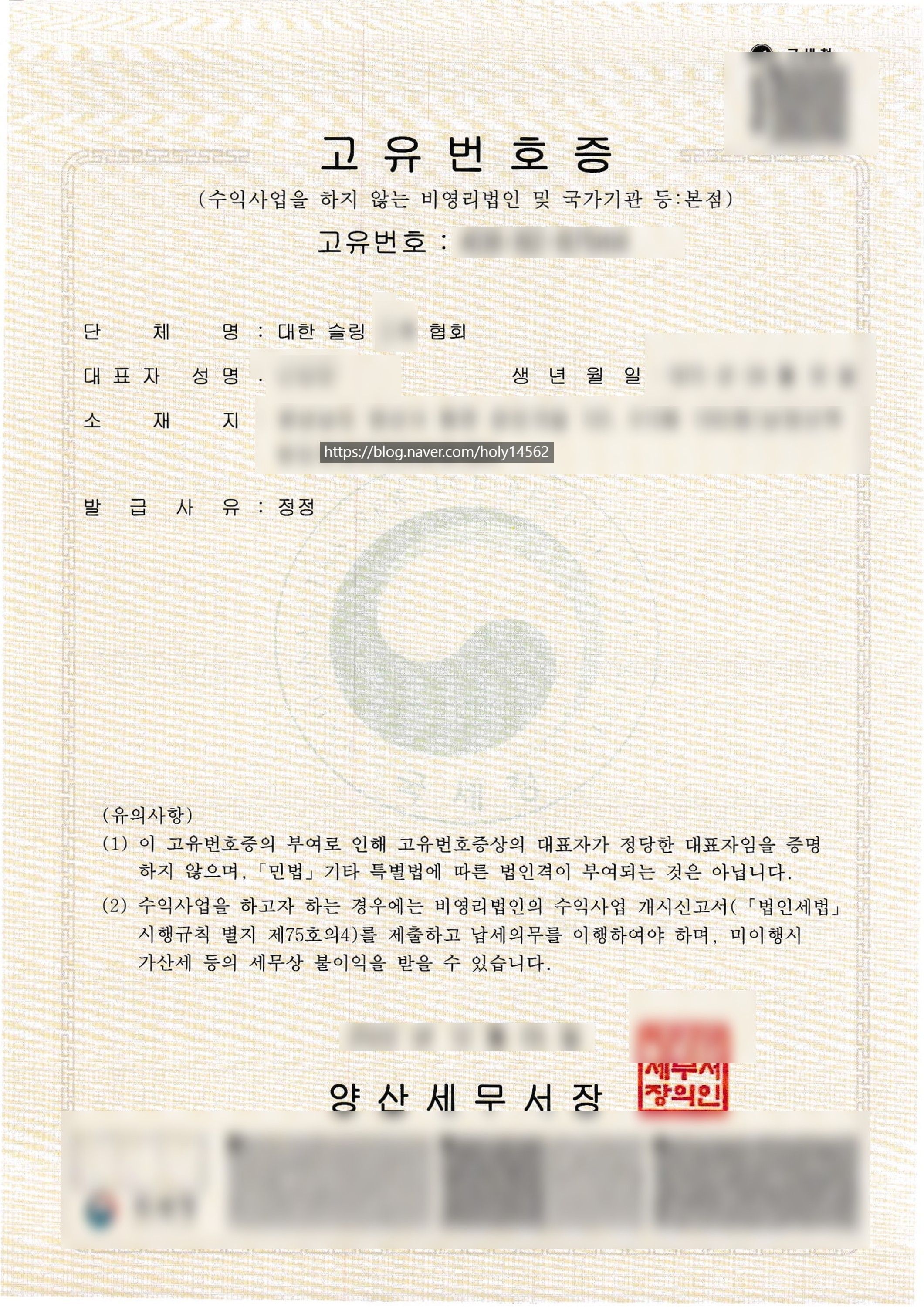 아래는 슬링 필라테스 자격증 등록을 위해 받급 받은 슬링필라테스 협회의 고유번호증입니다.
