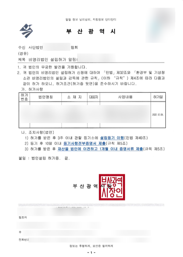안녕하세요. 오늘은 환경부 소관 비영리법인 사단법인의 설립 허가증을 수령하여 글을 씁니다. 이번 법인은 기존에 다른 법인에서 지부로 활동을 하셨던 분들이 독립 법인을 세운 케이스입니다.