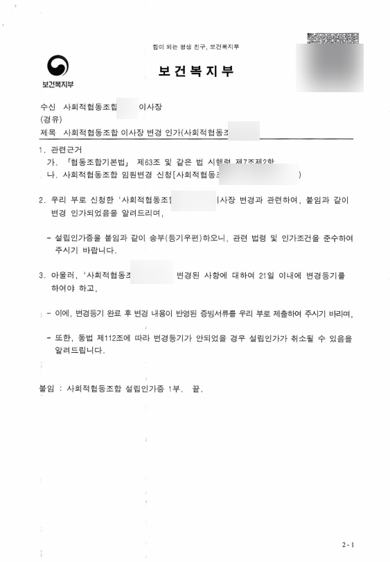 사회적협동조합 정관 변경 인가 완료 / 이사장 변경 등 병행