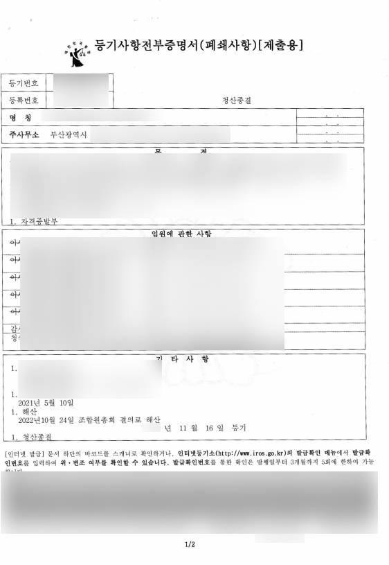 일반 주식회사 등 상법인의 경우 그냥 두면 되는 경우도 있다고 하던데, 협동조합, 사회적협동조합 등 주무관청의 신고, 인가, 허가를 받는 법인들은 그렇지 않습니다. 이번에 의뢰를 주신 분의 경우 작년 10월 정도에 말씀을 해주셨고, 준비해서 크게 무리 없이 처리할 수 있었습니다. 일반협동조합은 청산, 해산에 크게 문제가 없지만, 사회적협동조합의 경우 재산을 기부해야 하는 조건이 있기 때문에, 그 부분을 잘 처리해야 합니다.