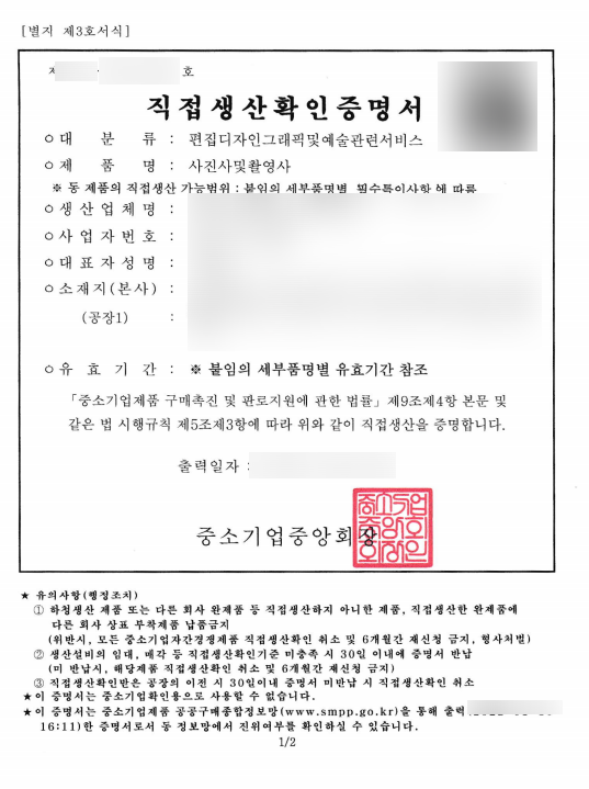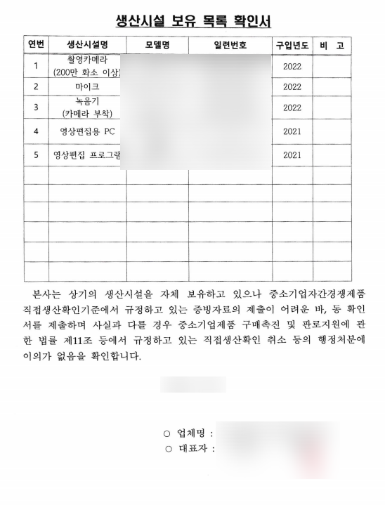 동영상제작 직접생산확인증명서 발급 시 필요한 서류는 다음과 같습니다.