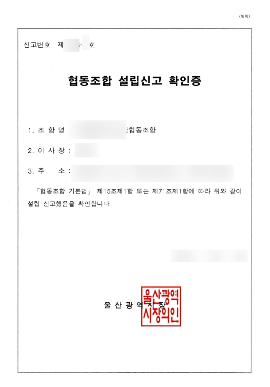 협동조합은 협동조합 기본법에 의해 신고 또는 인가를 받아 설립합니다. 일반협동조합의 경우 영리법인이며, 신고를 통해 설립합니다. 반면, 사회적협동조합은 비영리법인이고, 주무부처의 인가를 받아 설립합니다. 오늘 포스팅에 나오는 협동조합은 일반협동조합이며, 울산광역시청에 신고를 마치고 신고증을 받은 사례입니다.