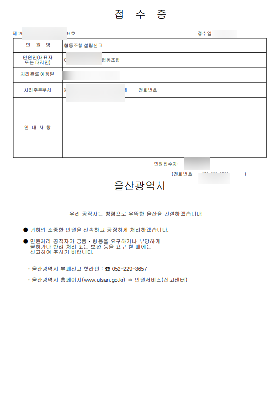 울산 협동조합 설립 신고 완료 / 협동조합 신고증 수령 및 설립 절차, 서류 안내