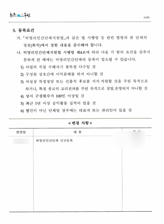 비영리민간단체 등록을 위한 조건은 아래와 같습니다.