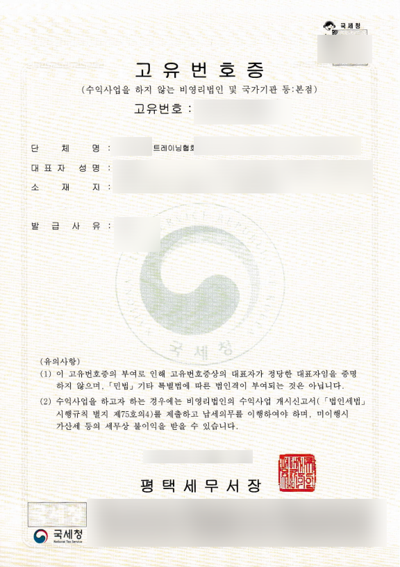 민간자격증 등록을 위한 협회 설립, 고유번호증 발급을 위해 필요한 서류는 다음과 같습니다.