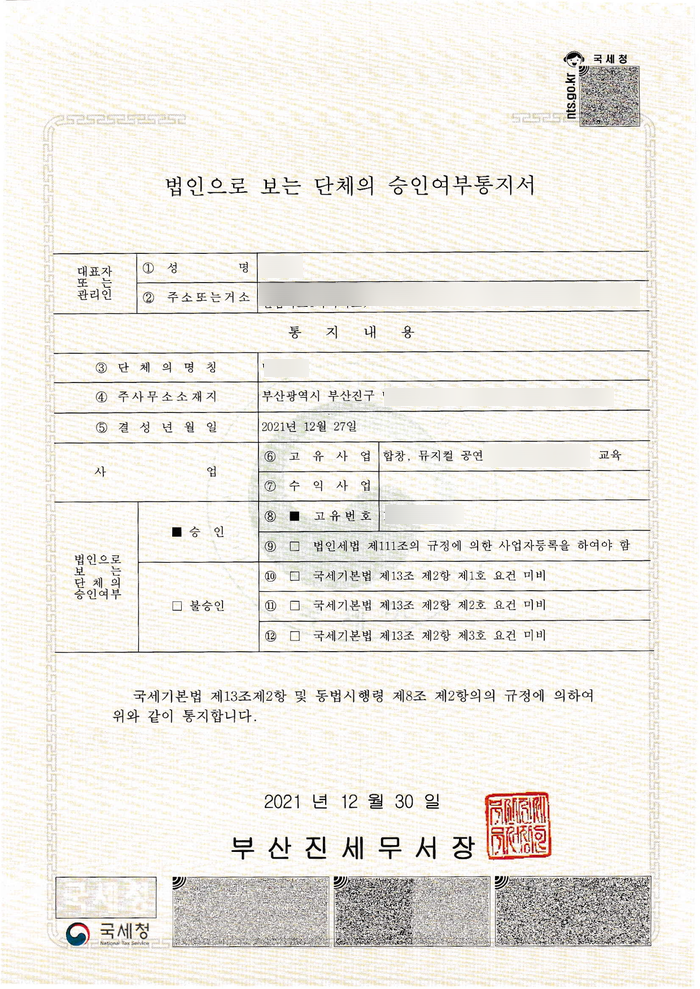 고유번호증이 발급되며, 단체명으로 통장을 만들어 관리할 수 있습니다.