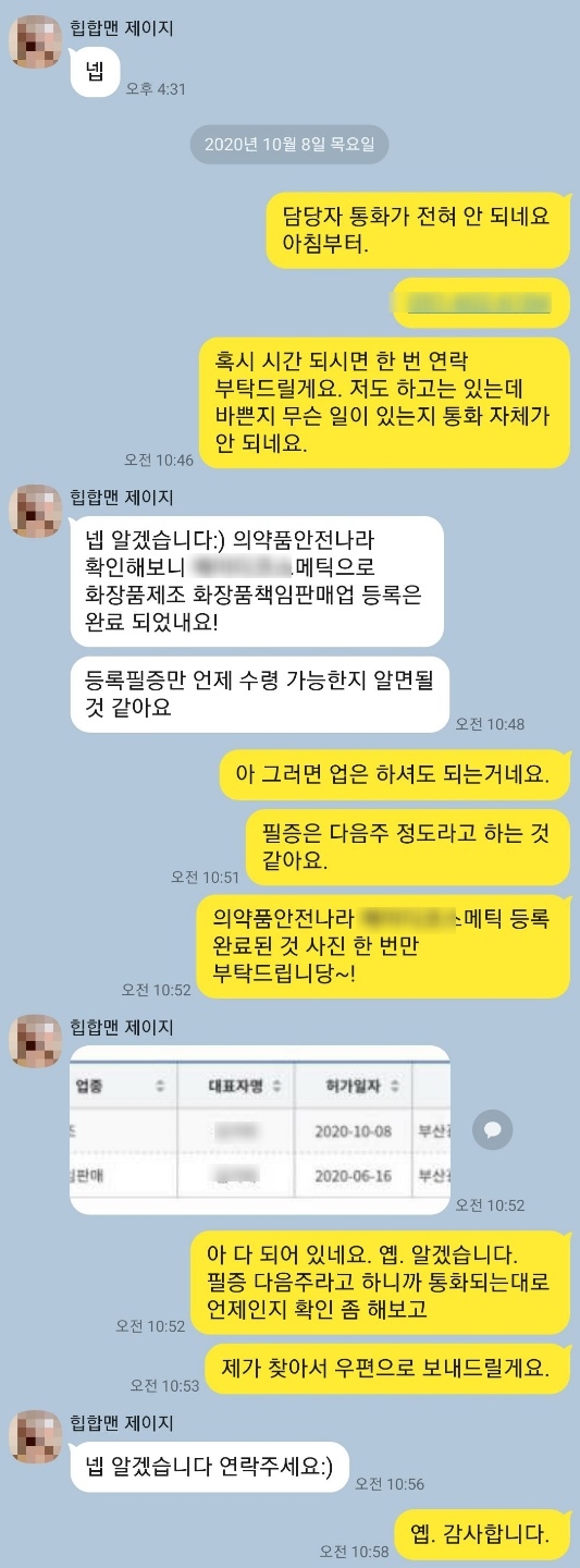 주말 포함 3주 소요가 되고 이 안에 실사가 나오고 화장품 제조업 등록증이 나옵니다.
